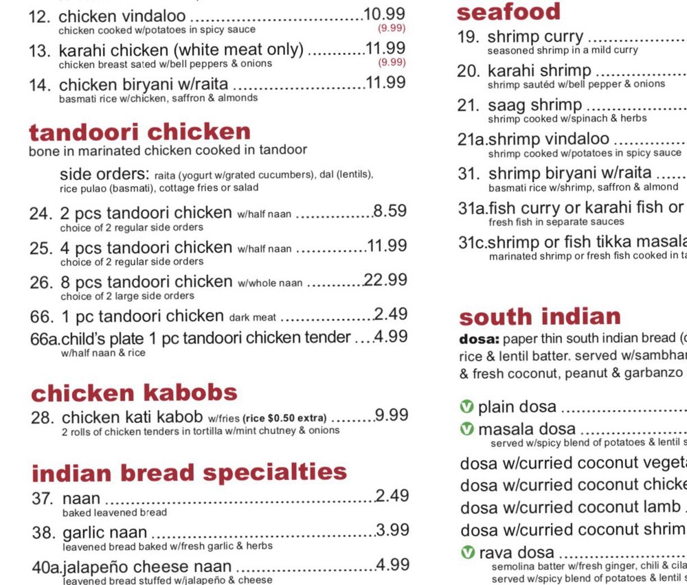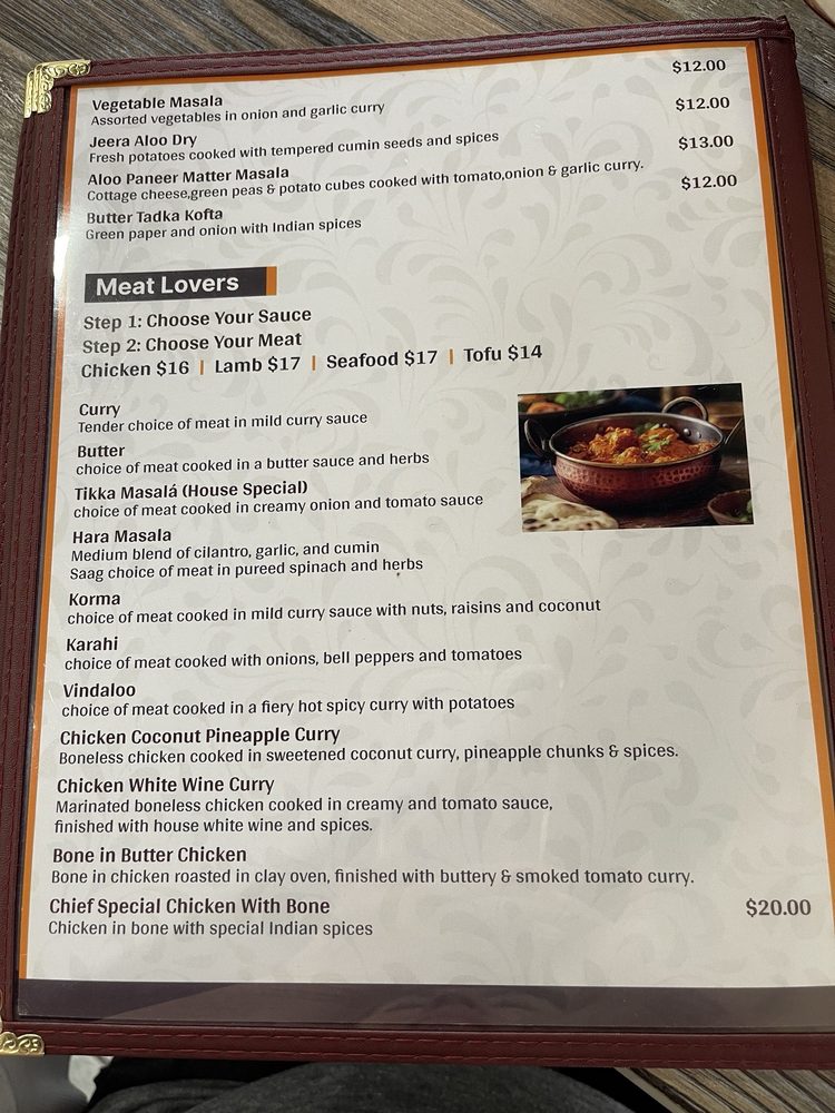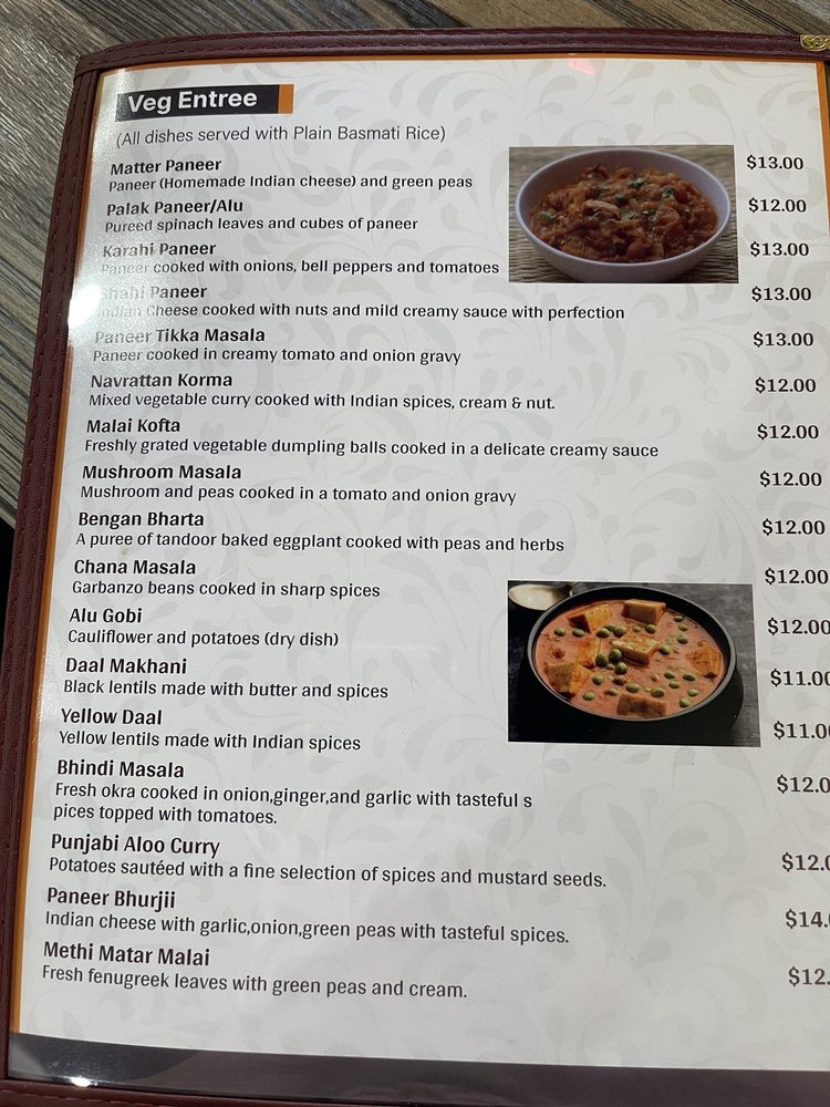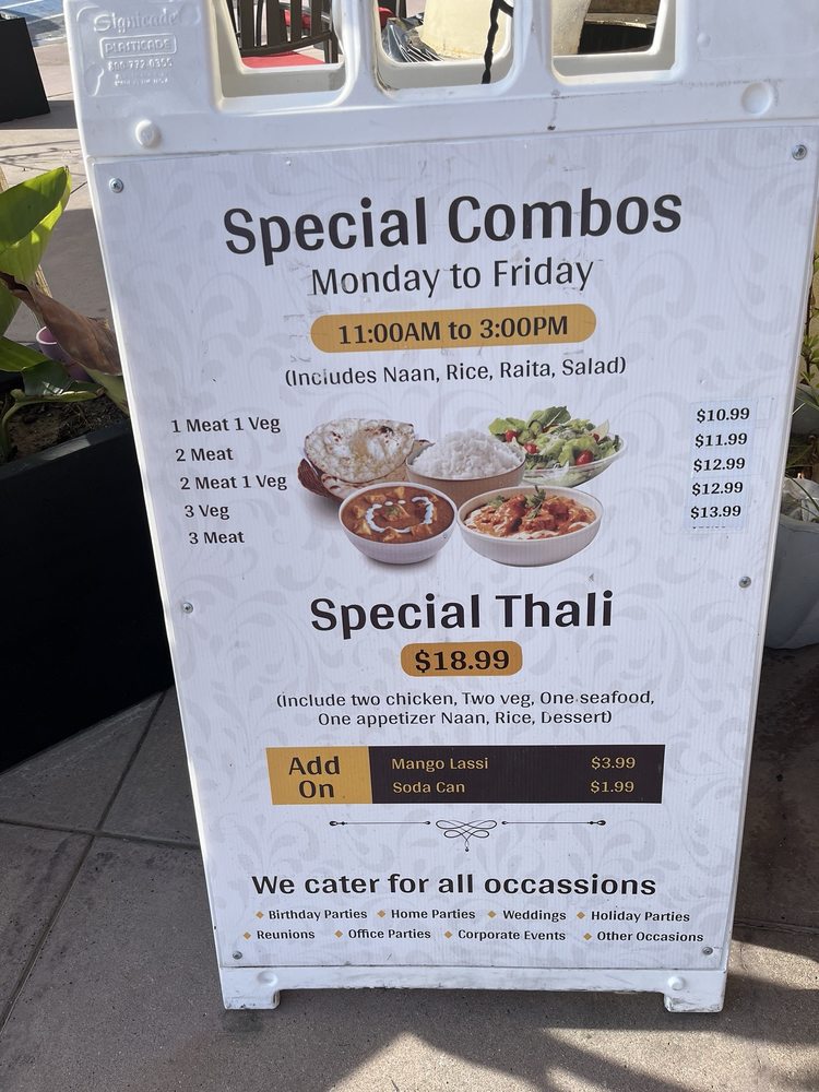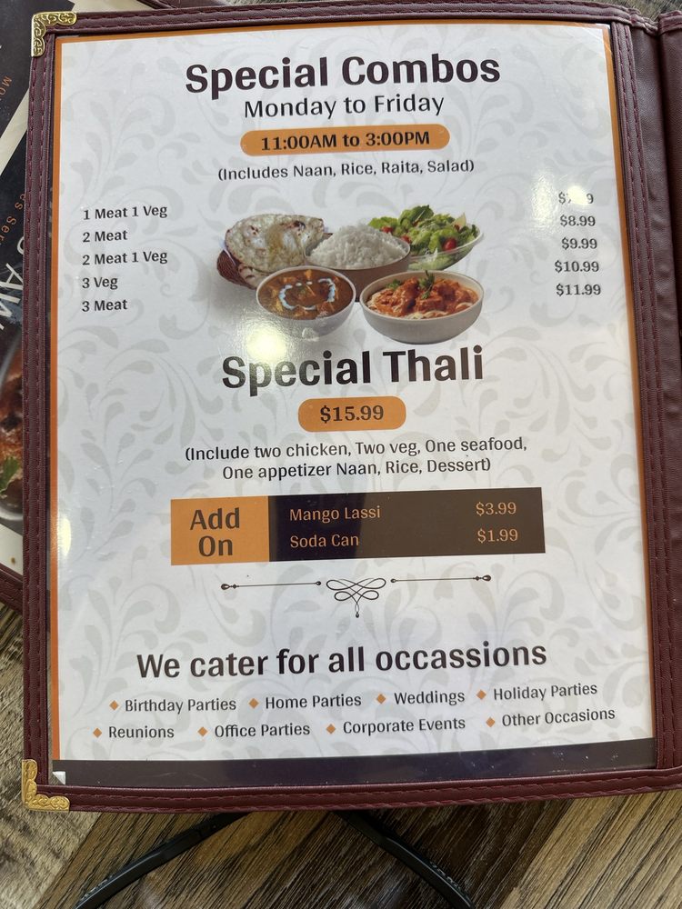 “ They have a lunch special menu that can't be beat. We ate there this week for lunch and we were impressed with the food quality and portion size. We ordered the one Thali special, $18.99 it's enough for two people. We will definitely back again. You will ”